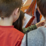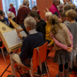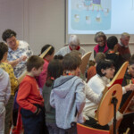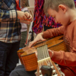 Im Anschluss an die Lesung durften nun die Kinder zusammen mit unseren Senioren selber mal an den Tischharfen, Gitarren und allen Instrumenten ausprobieren, wie dieses Instrument gespielt wird und wie es klingt.