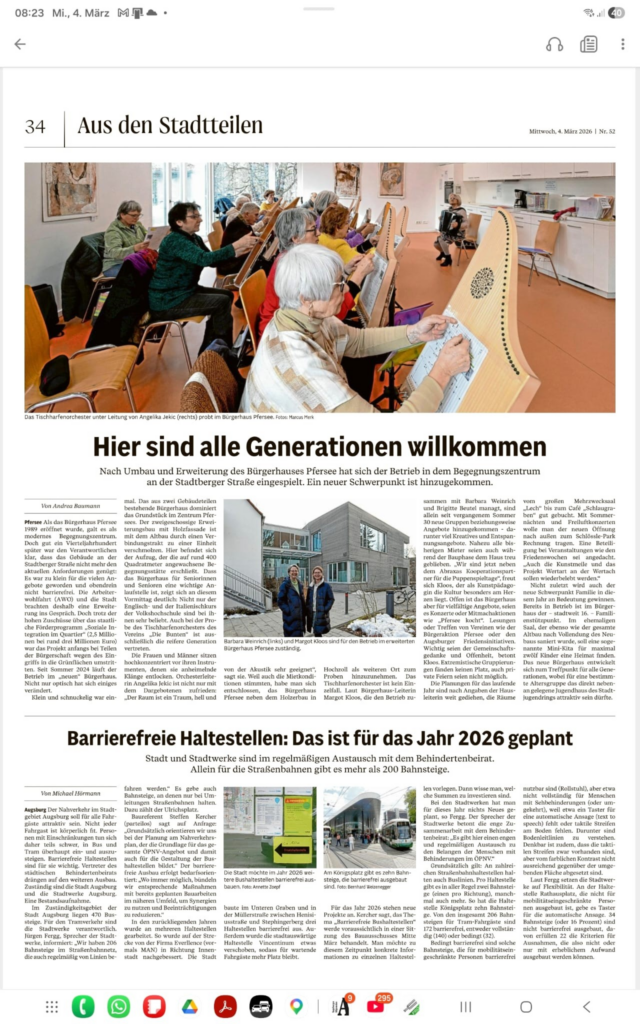 Ein Meilenstein in unserer Geschichte: „Die Bunten“ auf dem Weg nach Berlin Alles begann im Jahr 2022 mit dem Mut zur Bewerbung. Wir reichten unser Inklusionsorchester bei startsocial e.V. ein – und der Erfolg ließ nicht lange auf sich warten: Unter allen Bewerbern schafften wir es in die Auswahl der Top 100 Preisträger. Damit erhielten wir ein wertvolles Stipendium, das den Grundstein für unsere weitere Entwicklung legte. Intensive Arbeit – dank großartiger Coaches Von November 2022 bis Februar 2023 begleitete uns ein intensiver Prozess. Unsere beiden Coaches, Edwin Dorer und Elisa Kieselbach, unterstützten uns bei organisatorischen Herausforderungen, die weit über das Musizieren hinausgingen. Wir erarbeiteten Pläne für unsere Auftritte, entwickelten Konzepte für die Unterstützung durch Helfer bei Proben und Konzerten und setzten uns strategische Ziele für den Einsatz unserer Spendeneinnahmen. Unsere beiden Coaches Edwin Dorer und Elisa Kieselbach Diese Zeit der strukturellen Arbeit hat uns als Verein ein gewaltiges Stück nach vorne gebracht. Der Weg nach Berlin Die Mühen wurden belohnt: Unter den 100 Stipendiaten wählte die Jury uns als eines der 25 besten Projekte aus, die zur feierlichen Preisverleihung am 13. Juni 2023 nach Berlin geladen wurden. Für „Die Bunten“ fuhren Angelika Jekic, Jürgen Wagner und Tatjana Jekic (die unsere Social-Media-Kanäle so lebendig hält) in die Hauptstadt. Dort trafen sie nicht nur viele Gleichgesinnte, sondern auch den damaligen Bundeskanzler Olaf Scholz. Ein bewegender Moment der Anerkennung Der Höhepunkt war die Laudatio des stellvertretenden Vorstandsvorsitzenden der Deutschen Bank, Karl von Rohr, deren Worte uns noch heute berühren: Inklusion ist in Deutschland noch längst nicht gelebter Alltag. Jeden Tag werden Menschen aufgrund ihrer Beeinträchtigungen ausgegrenzt. Zum Glück gibt es auch viele Beispiele, die Hoffnung machen. Projekte, die sich auf verbindende Wesensmerkmale konzentrieren – und nicht auf trennende. Die es sich zur Aufgabe gemacht haben, das zu fördern und zu feiern, was uns alle gemeinsam als Menschen auszeichnet. Was wir erleben, wenn wir Gefühle mit anderen teilen, zusammen etwas Neues erschaffen und Teil von etwas Größerem sind. Dabei gibt es wohl kaum einen Anlass, der diese Merkmale besser vereint, als das Musizieren in einem Orchester. https://www.db.com/news/detail/20230613-ehrenamtliche-heldinnen-und-helden?language_id=3 Dann war es soweit: Mit klopfendem Herzen betraten wir die Bühne, nahmen unsere Urkunde entgegen und erhielten die persönlichen Glückwünsche von Bundeskanzler Olaf Scholz. Ein Moment voller Stolz, der zeigt: Inklusion ist kein Nischenthema – sie gehört ins Zentrum unserer Gesellschaft. Wir sind stolz auf diesen Weg und danken allen, die uns dabei begleitet haben! Mit dem Preis ist ein Preisgeld von 5.000€ verbunden. Feedback unserer Fans Glück kann man nicht kaufen, aber wenn man begeistert „Die Bunten“ begleitet kann man es erleben. Irene Mühlberger Links aus der Presse https://startsocial.de/startsocial-wettbewerb-2022-23-die-sieben-preistraeger-stehen-fest https://www.veeh-harfe.de/tischharfenorchester-die-bunten-preistraeger-beim-startsocial-wettbewerb-2022-23/ Deutsche Bank Bundesregierung Rede von Bundeskanzler Olaf Scholz Schwäbische Nachrichten Aichacher Zeitung