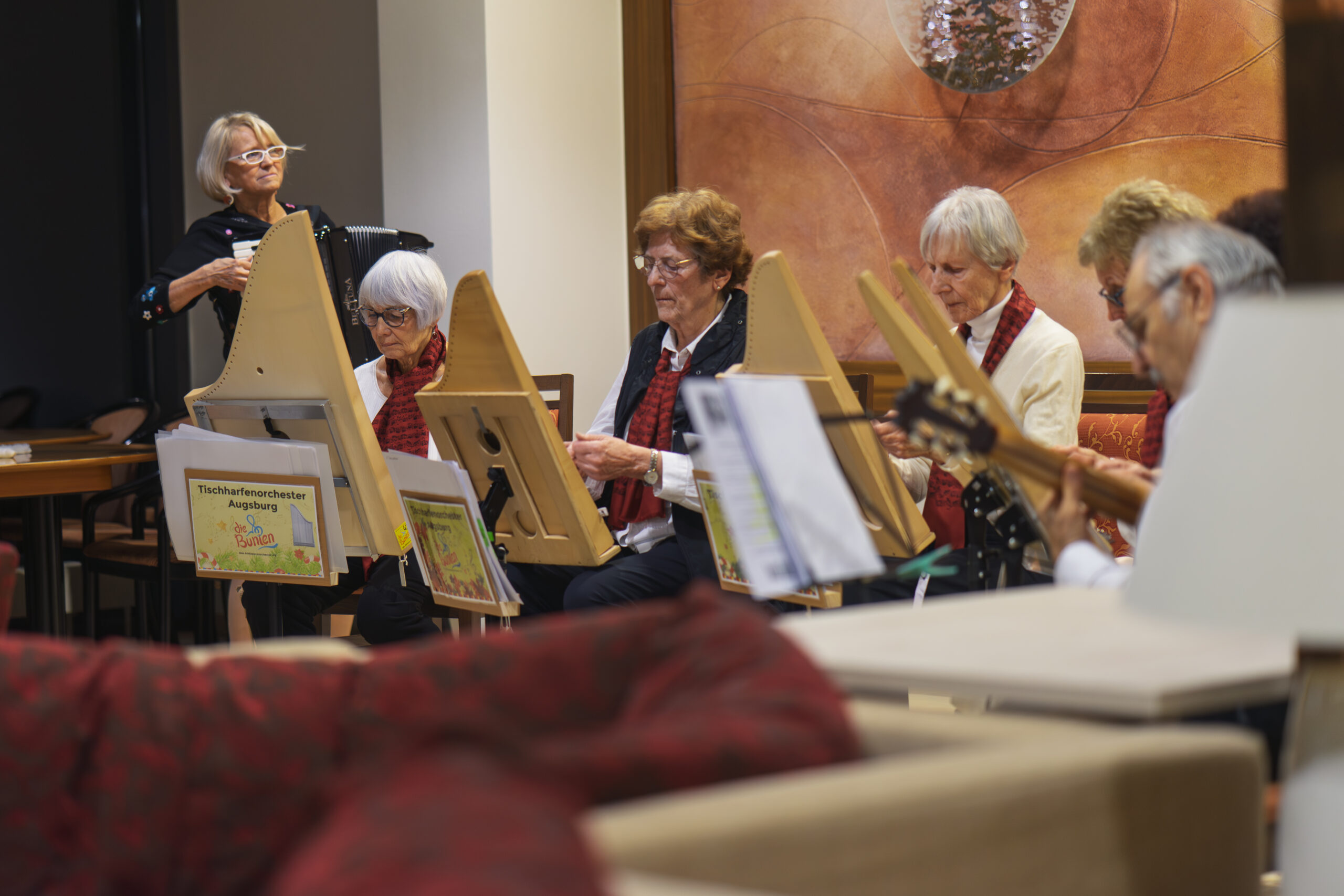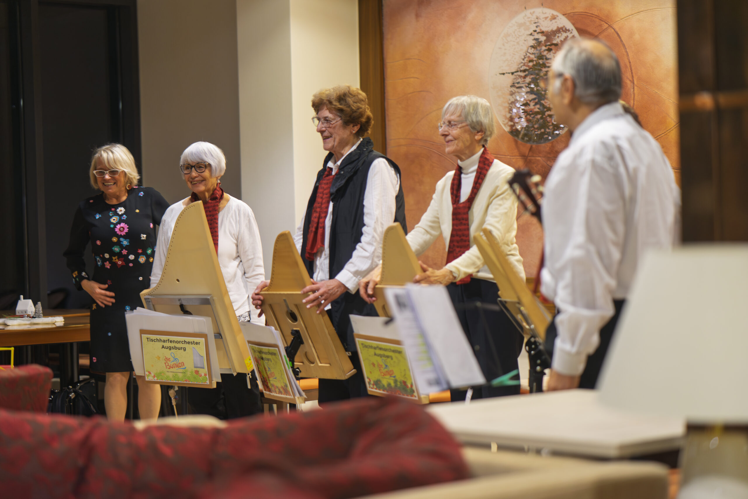 Das Tischharfenorchester probt jeden Freitag um 9:15 im Bürgerhaus Pfersee und jeden Mittwoch um 9:30 im Holzerbau